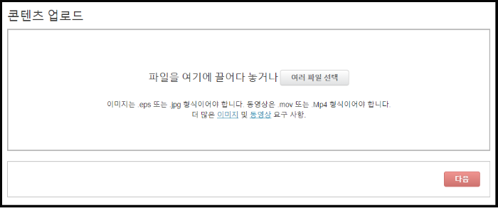 우선 대시보드 초기화면에서 왼쪽 상단의 "콘텐츠 업로드"를 눌러주면 아래와 같은 화면이 나타납니다. 내 파일 폴더를 열어서 사진을 선택한 뒤, 아래와 같이 보이는 사각형 박스로 사진을 끌어다 놓아도 되고, 한 번에 여러 개의 사진을 등록하고자 하는 경우에는 "여러 파일 선택" 버튼을 클릭하여 주시기 바랍니다. 저는 일단 우선은 한 개의 파일을 먼저 등록해보겠습니다.